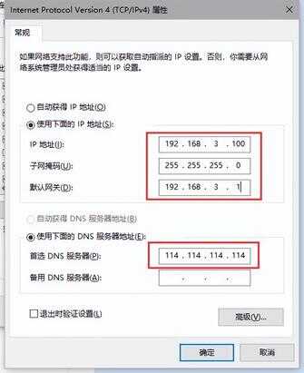 ④如果【选择使用下面的IP地址】,则需要手动输入IP地址,前提是需要知道具体的IP地址,在遇到QQ能上但网页打不开时,上面一栏可以选择【自动获得IP地址】,下面一栏选择【使用下面的DNS服务器地址】,并输入114.114.114.114(全国通用),设置完成后点击确定(注意:点击【确定】后,回到上一层界面还需要再点一次【确定】,否则更改不生效)。