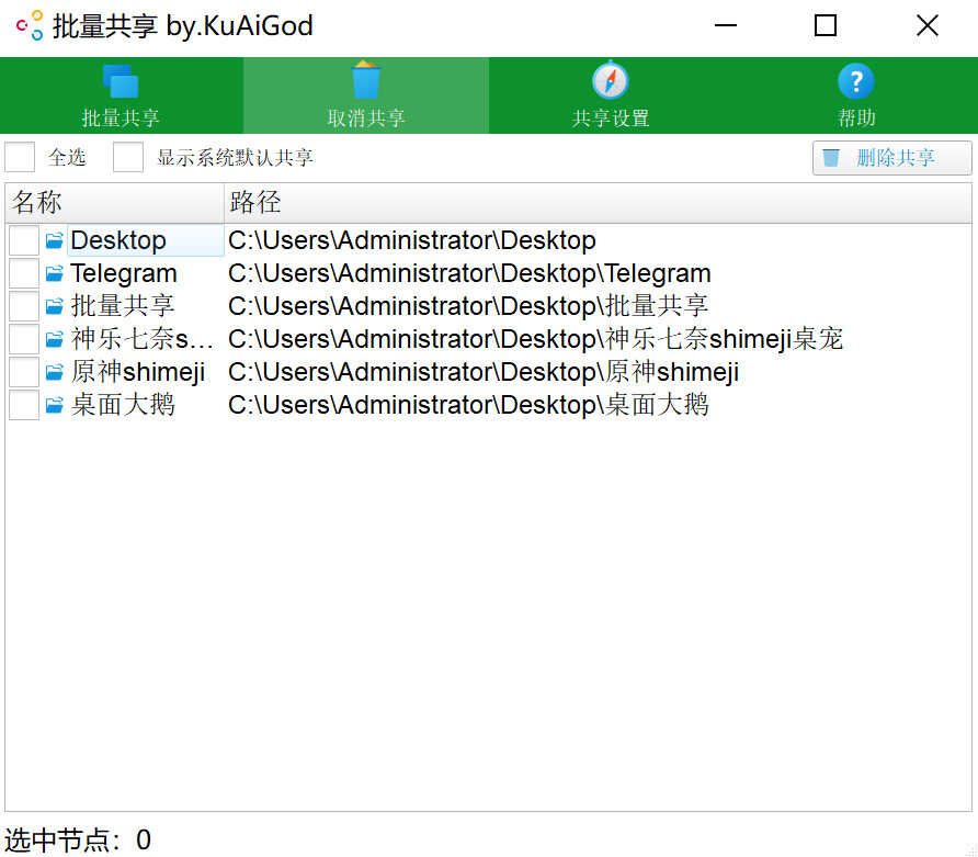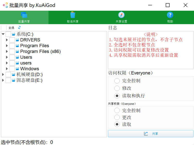 3. 勾选需要设置共享的文件夹,并设置相应的共享和安全权限,一键完成批量设置。