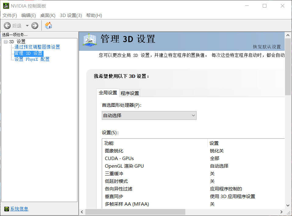 进入管理3d设置,我们可以把这个首选图形处理器改成高性能NVIDIA处理器,这样运行软件或者游戏就会发挥独立显卡性能。