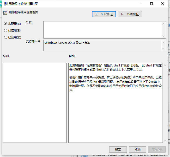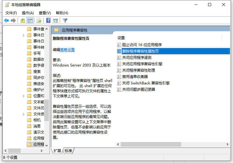 2、在本地组策略编辑器窗口中,展开至“计算机配置》管理模板》Windows组件》应用程序兼容性”,在右侧找到“删除程序兼容性属性页”并双击打开;