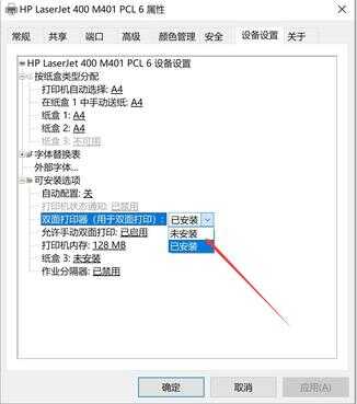 下面有个可安装选项中的双面打印器后面大家看看是否是已安装或者是未安装,然后选着已安装就好。