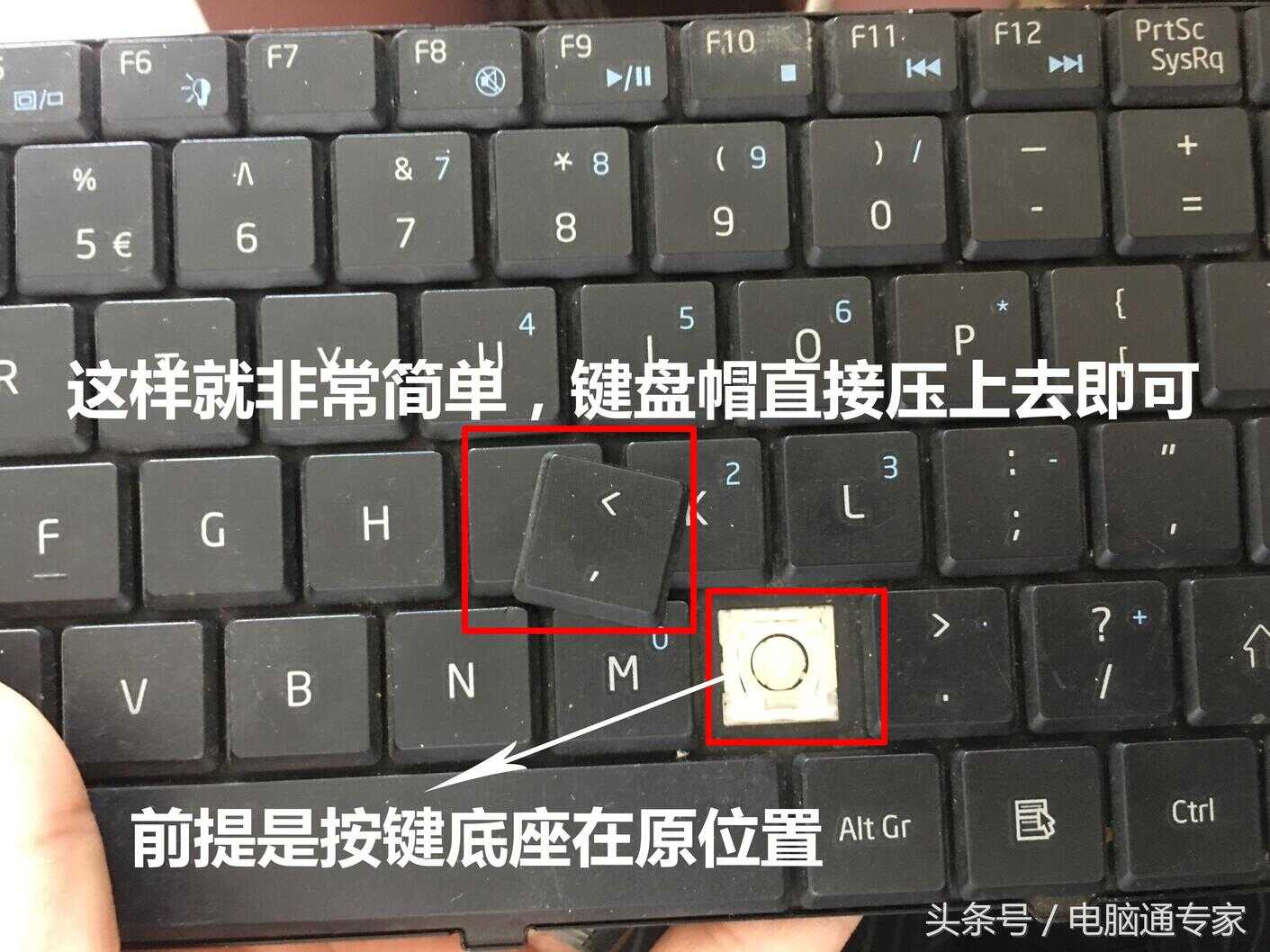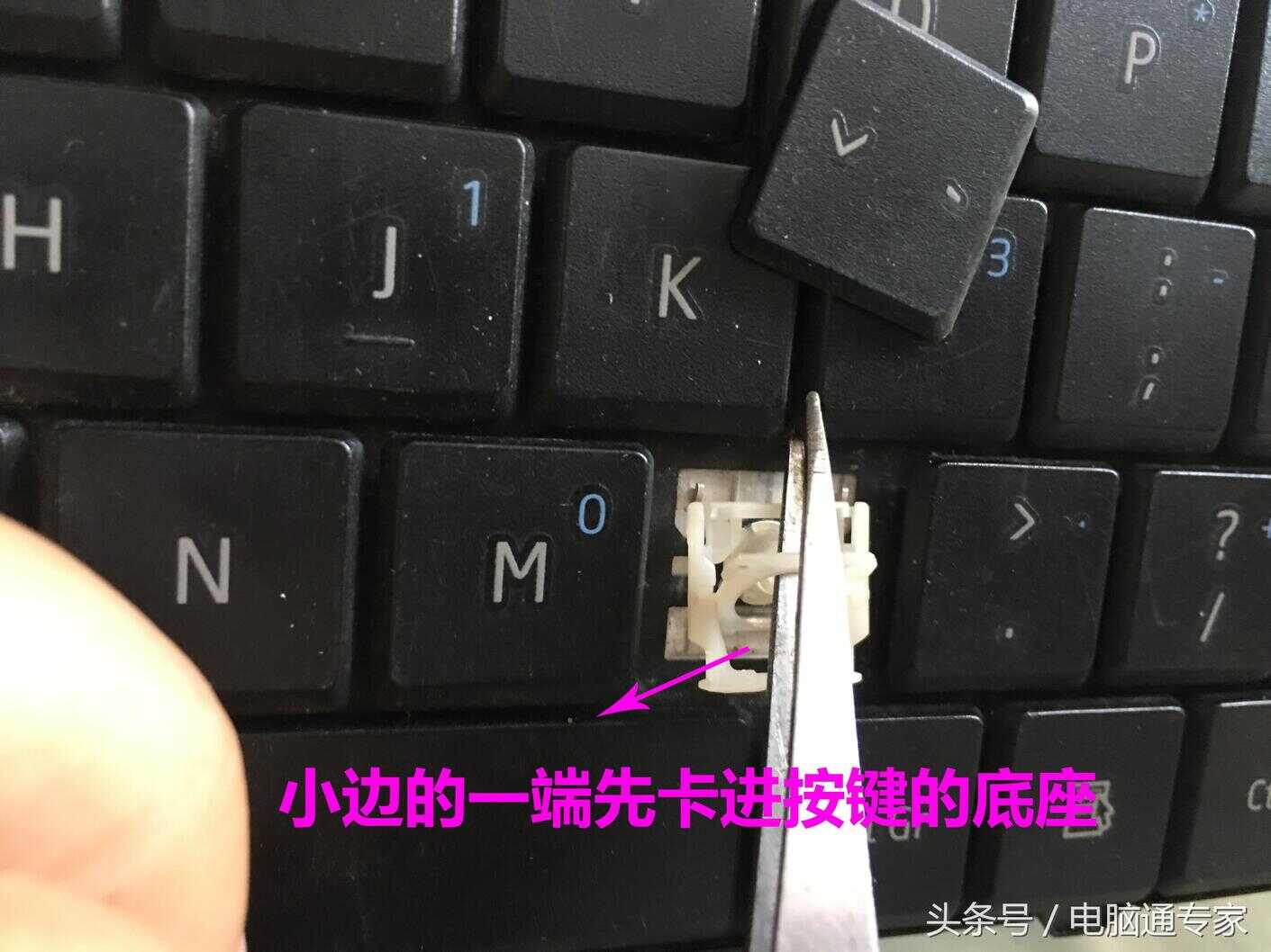 先把小边扣在键盘按键的底座上面