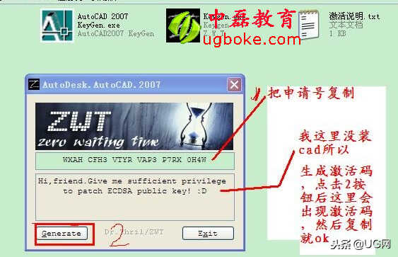 3、运行注册机,将申请码复制在注册机输入框内,点击generate生成激活码,然后复制激活码,返回CAD中输入激活码,区域选择“中国”,激活完成。