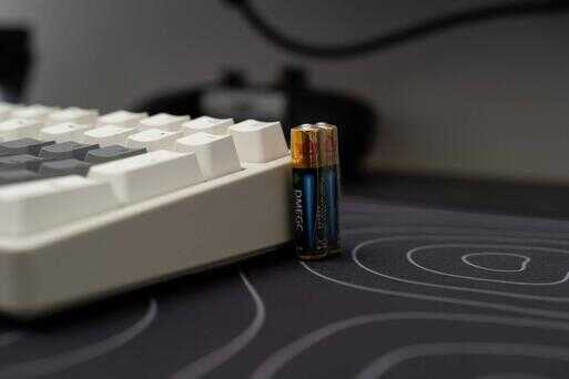 高度部分继承了传统机械键盘的高度,和7号电池对比,最上部的高度加上键帽和7号电池立起来的高度差不多,键盘本身也有4/5的高度。
