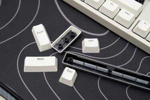 这款键帽使用的是双色的PBT材质键帽,外壳是白色,而内部是黑色,可以观察到的是空格键键帽的内部还是有高光的,和Enter键的内部有些区别。PBT材质键帽仔细看起来可以看到表面是凹凸不平的,相比ABS更耐磨、抗油。上面的字印清晰无毛刺,字体的感觉不错。