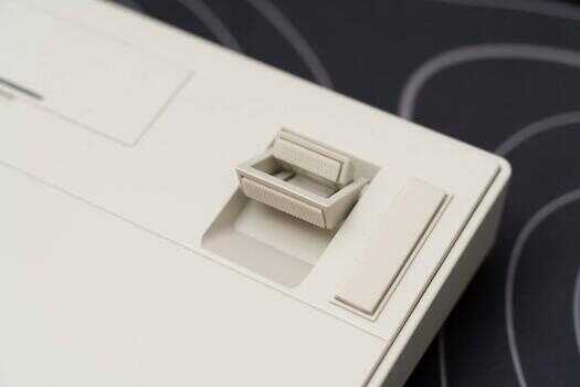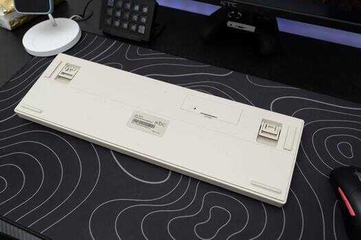 再看看背面,四个角一共四个防滑脚垫,左右两边有两个脚撑,两段式的高度调整,每种高度底部都有防滑脚垫,都是ikbc的标准设计。