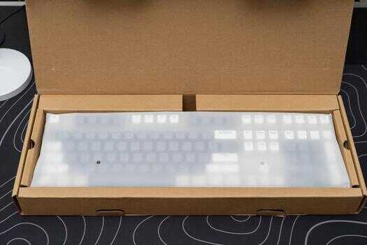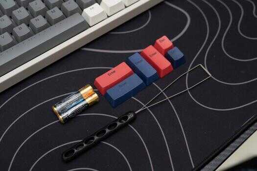 打开之后就能看到被包裹的键盘,配件部分有一份说明书、拔键器、两颗7号电池、6颗键帽。