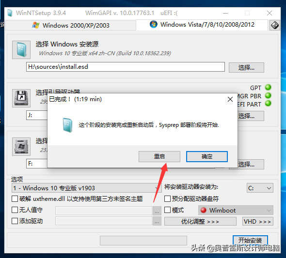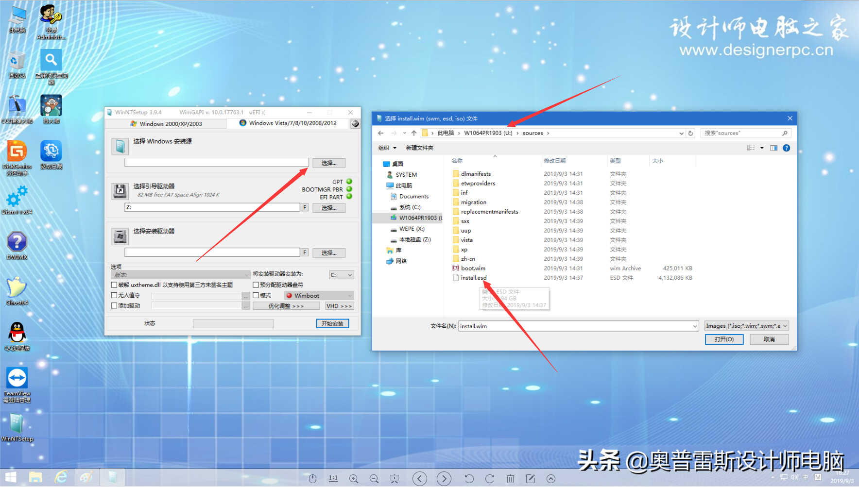 3. 打开WinNTSetup,第一行选择WINDOWS镜像(赠送U盘的镜像在U盘下的sources文件夹下install.esd文件),注意GPT模式第二行选择引导驱动器为硬盘第一个隐藏分区
