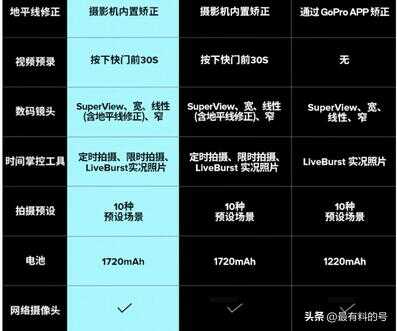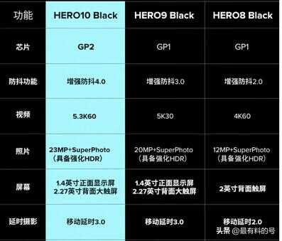 关于GoPro HERO8、GoPro HERO9和HERO10 的详细区别,大家可以看看下面这张图片,各方面对比让你可以一目了然。