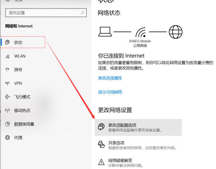 2、接着打开了网络和internet设置的窗口,此时选择的是左侧的状态,然后选择右侧的更改适配器选项。