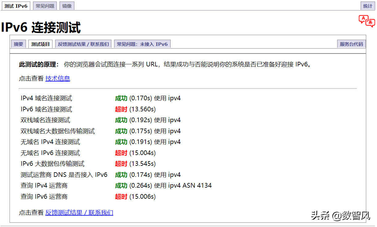 另一种方法就是利用测试网站来测试,你可以用浏览器尝试打开纯IPv6网站(比如:test-ipv6的纯IPv6站点)。如果可以成功打开页面,证明你的网络已经完整支持IPv6了。如果你无法打开网页,想知道什么原因。可以打开test-ipv6的IPv4网站。打开后,该网站会自动测试你的IPv6支持情况。