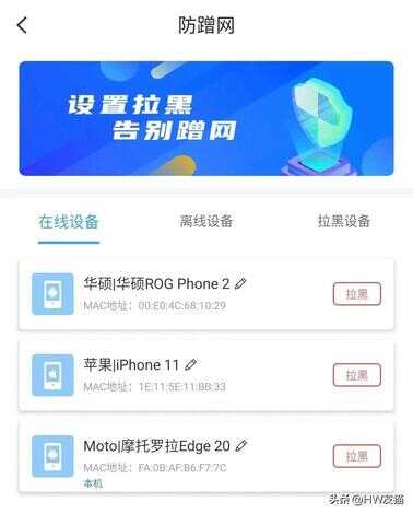 选择防蹭网,就可以看到在线设备、离线设备、拉黑设备。