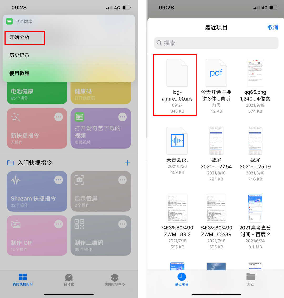 5.最后打开【快捷指令】,点击“电池健康”的指令,选择【开始分析】,从文件夹内找到储存的“log”开头的文件,直接点击。