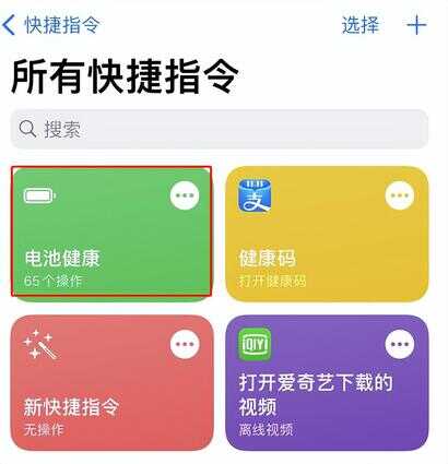 2.查询充电次数需要用到【快捷指令】,先添加“电池健康”的快捷指令。(