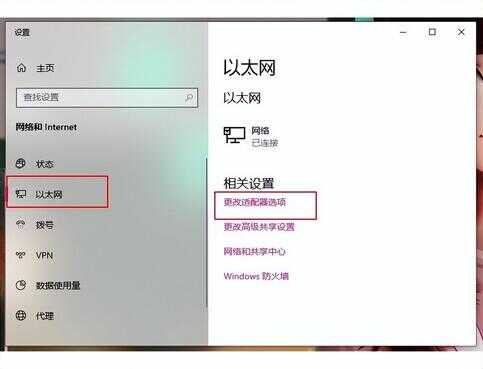 2、 点击左侧“以太网”,继续点击右侧“更改适配器选项”。