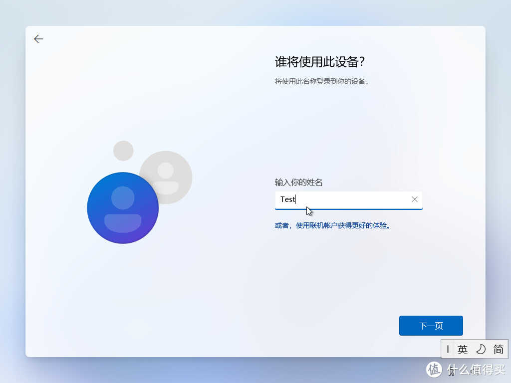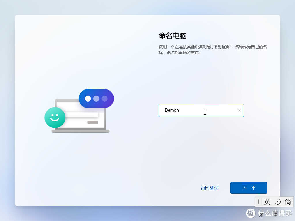 这里新加了一步命名电脑,这里输入的是计算机名,不是你的用户名。(这里计算机名和用户名是不能一样的)这点还是挺不错的,不需要进系统之后改计算机名了。