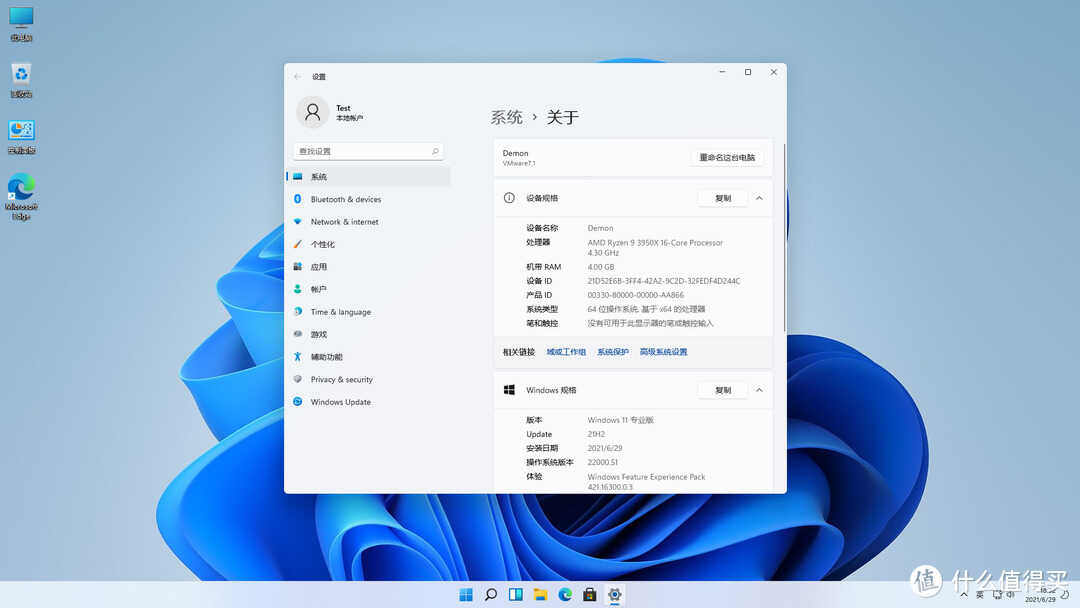 设置菜单改的也不少,到这里开始使用物理机和虚拟机共同演示。可以看到版本好是21H2,足矣证明这个版本就是曾经的21H2的太阳谷更新,微软直接做成的全新的Win11。