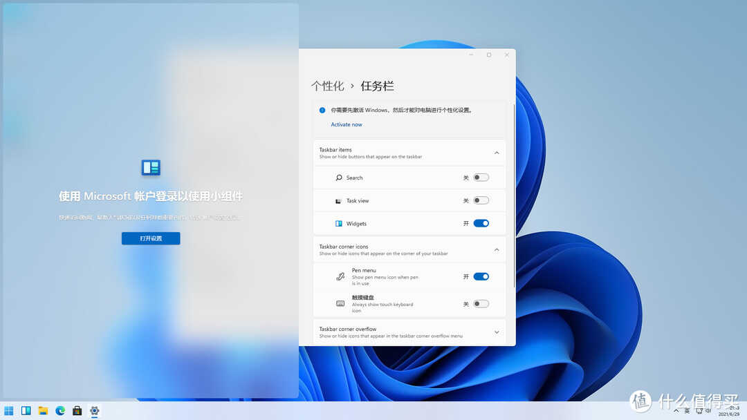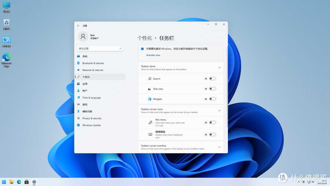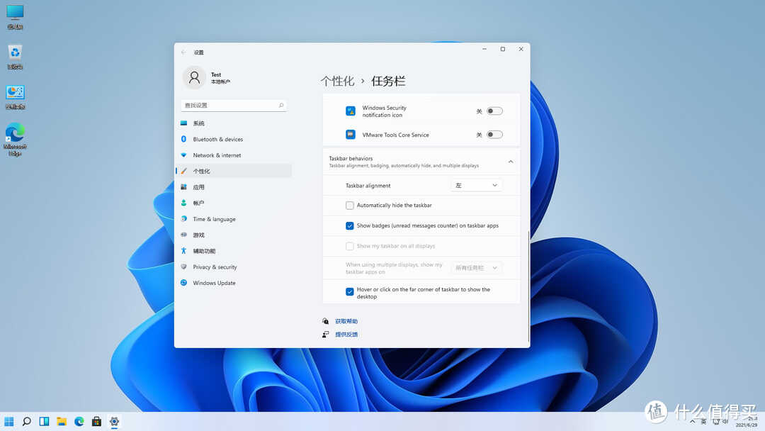 当然第一步就是把开始菜单放到左边,Win11里面这个叫做任务栏。可以看到设置中有很多还是没有汉化完整的。