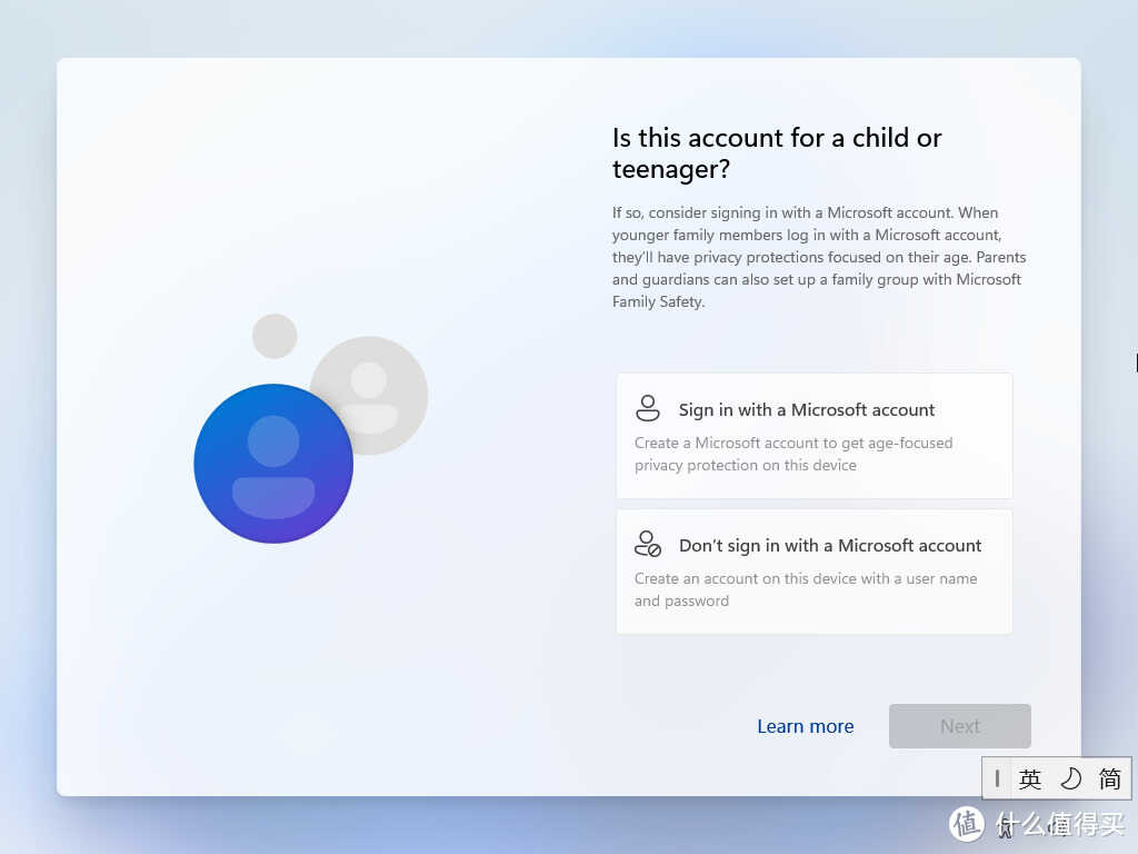 这里突然有一张没有汉化的界面,这个界面就是问你是用微软账户还是本地账户,直接点第二个就行了。