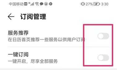 接下来我们需要关闭应上一些自带的广告,打开日历以后,大家需要点击右上角的4个点选项,大家会看到有一个订阅管理这个选项,我们点击一下,如果这属于服务推荐,属于一个订阅的状态,所以说我们需要把这个订阅也关闭。