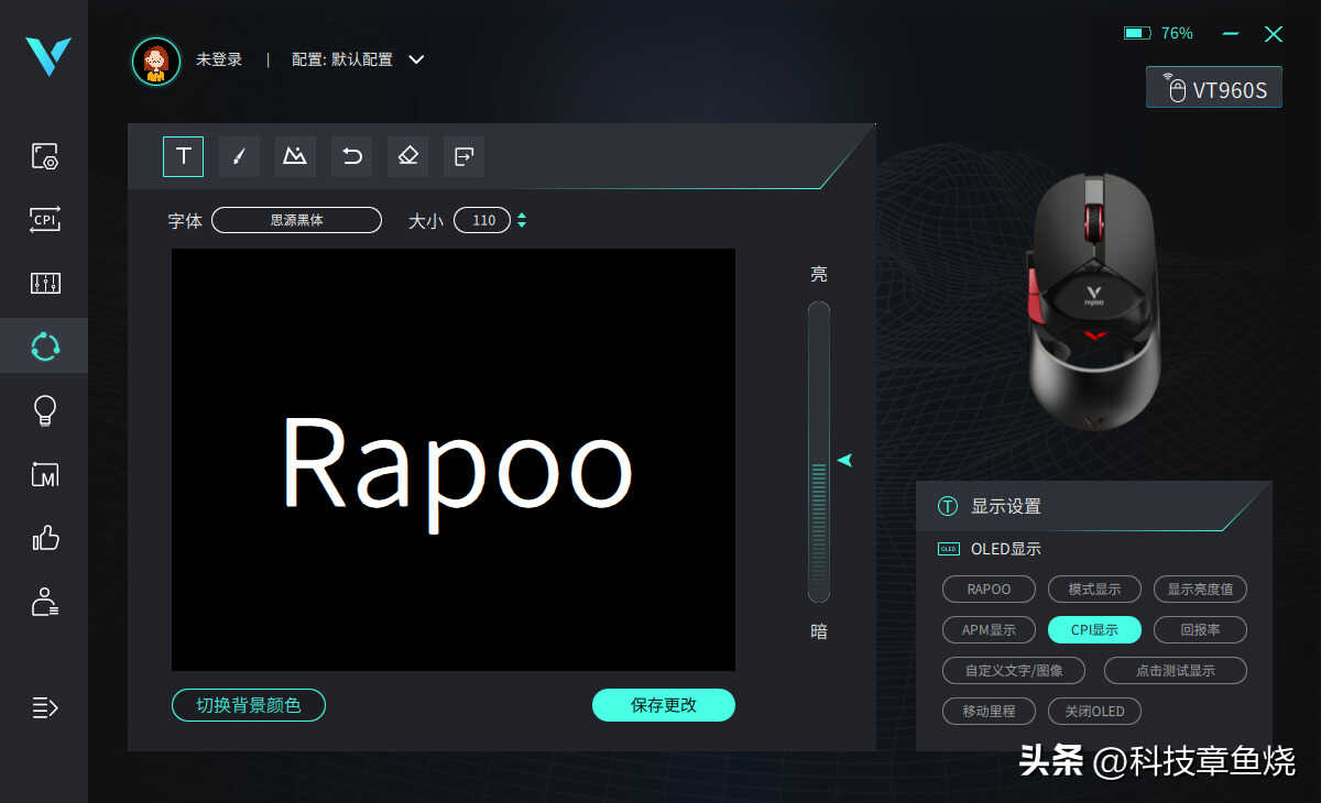 确定好后鼠标的形态模式后,还可以在驱动软件上进行多方面的设置。例如在操控性方面,就可以设置CPI档位(50-19000DPI)、自定义9个按键的功能、宏指令、指针/滚轮速度(125-1000Hz)以及选择设置好的参数配置文件,这些设置都可以根据你玩的FPS、MOBA游戏进行具体设置。另一方面的个性化设置,则可以自由设置OLED屏显的显示内容,文字图片都可以。RGB灯光就更不用说了,玩家可以自由设置RGB的灯效模式、颜色、亮度,把鼠标“打扮”成这条街更靓的“仔”。