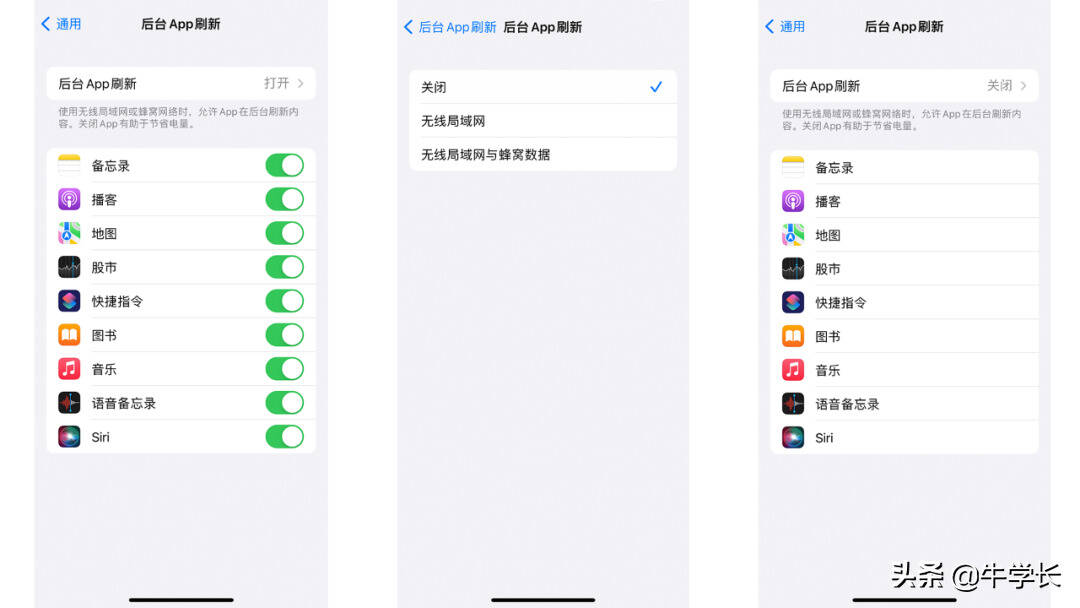 开启【后台App刷新】十分影响电池续航,关闭后并不会在开启APP时速度明显下降,也不会错过消息接收。