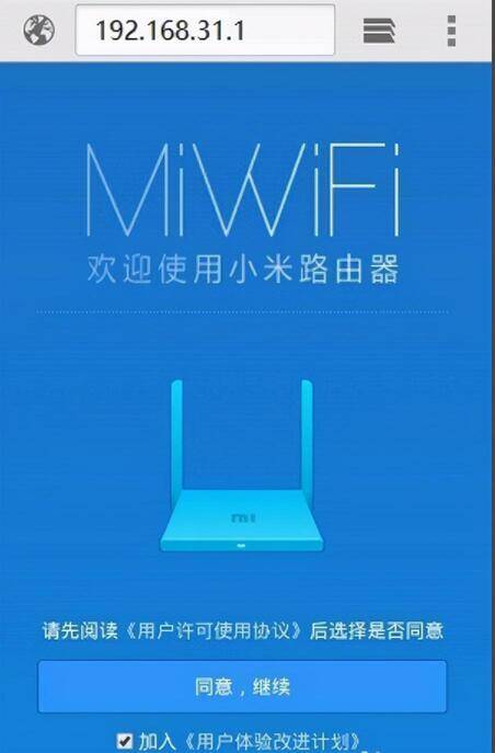2、打开手机或电脑上的浏览器,在地址栏输入miwifi.com或192.168.31.1,进入到首页,点击同意进入到下一步配置。