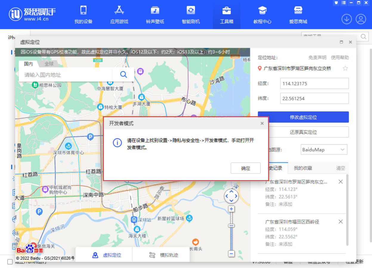 小提示:在设备上打开“开发者模式”后,可通过爱思助手虚拟定位功能修改设备位置(如要恢复正常定位,重启设备进行还原)。