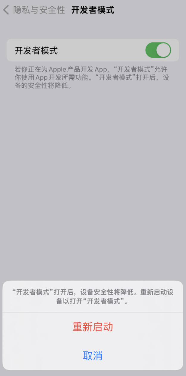 根据提示前往 iPhone “设置”-“隐私与安全性”,可发现“开发者模式”现在已经显示出来,请打开开关并重启设备。