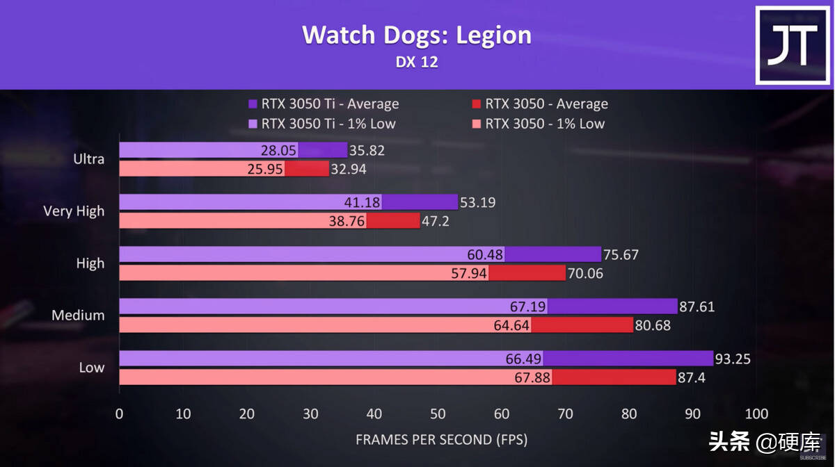 在看门狗:军团中,1080p高特效不开启光追设置下,3050ti比3050高了5.61帧,8%。差距进一步缩小。