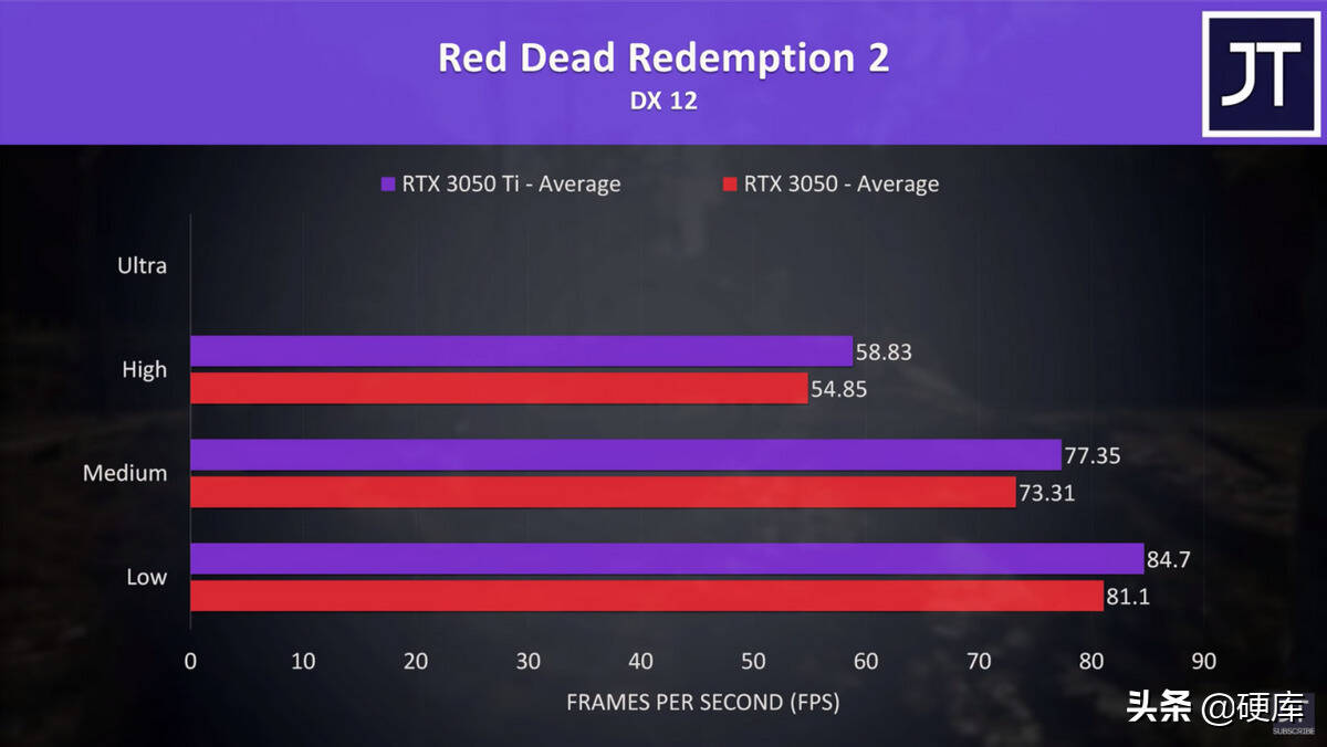 在荒野大镖客2中,1080p中特效下,3050ti也仅仅高了4帧,5.4%。这样的性能表现差距可以说完全是同水平的级别。