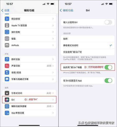 步骤3:到这里我们只需要把【始终用“嘿Siri”唤醒】给打开即可完成设置。