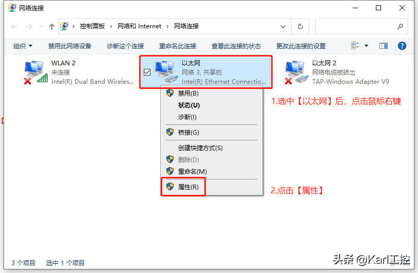 - 在弹出的【网络连接】窗口,选中【以太网】后点击鼠标右键,在弹出的选项卡中点击【属性】选项