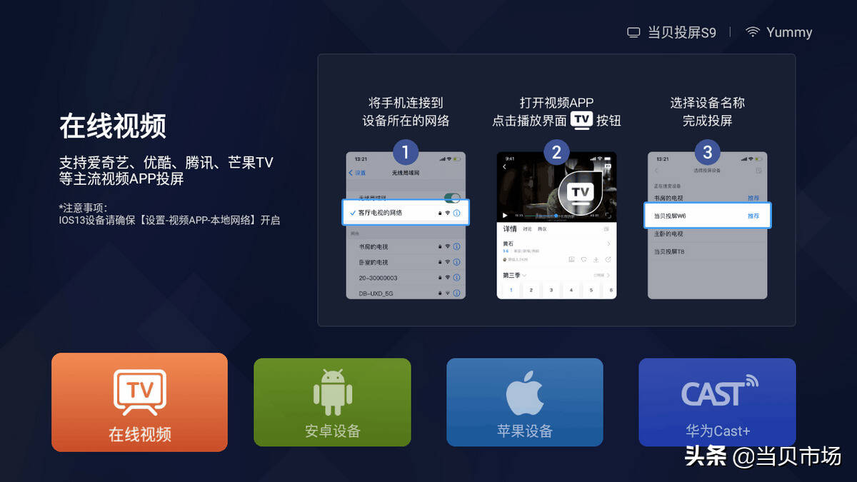 在手机端的视频软件或其他投屏软件里的投屏设备选项里找到【当贝投屏】上显示的设备名称,进行投屏即可。