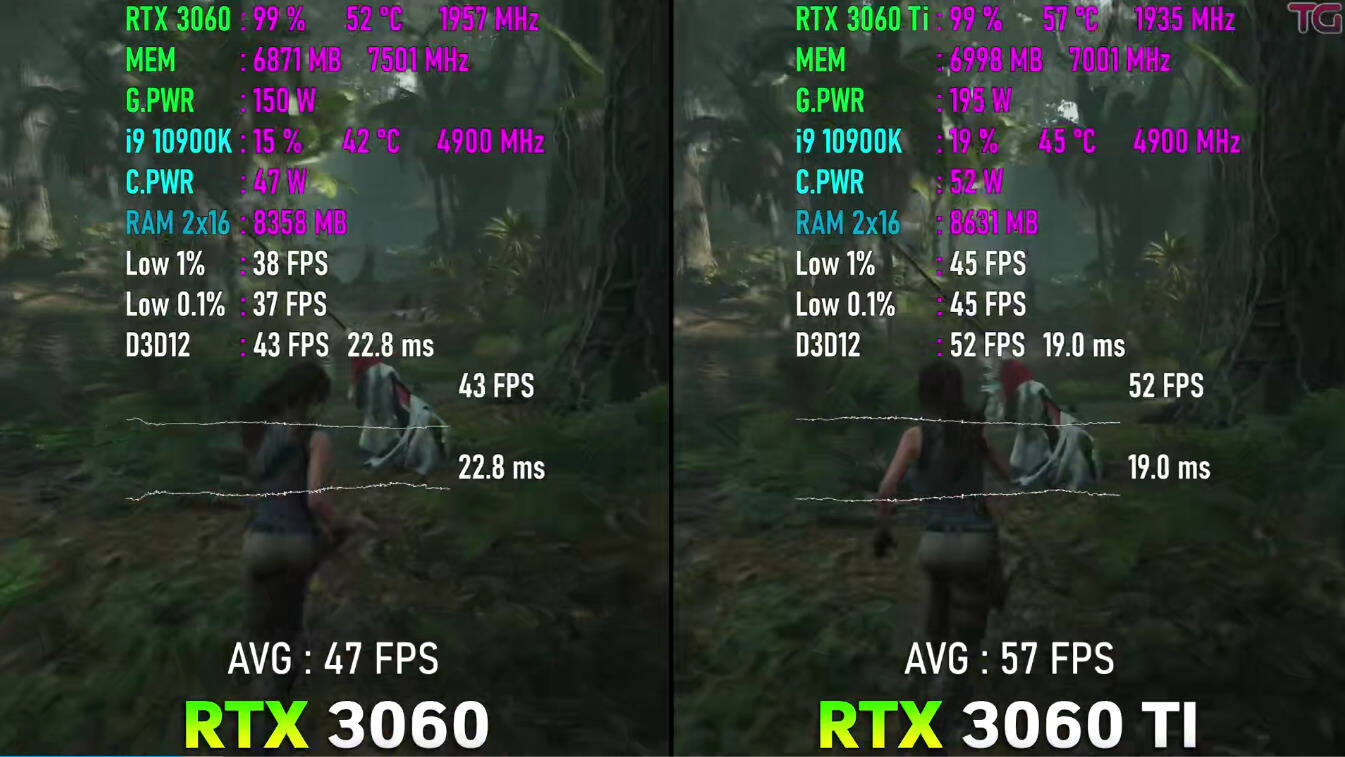 在游戏中两款显卡的差距倒没有跑分那么大,综合差距在20%左右。不过需要特别说明的是,在高分辨率下,RTX3060TI几乎可以跑满60帧,而RTX3060则不行。