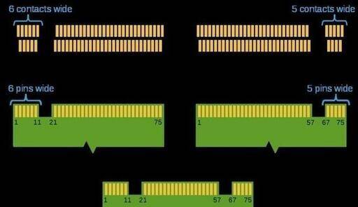 M.2前身为NGFF接口,分为B-key和M-key和BM-Key三种规格。B-Key支持PCI-Express x2和SATA Socket 2,M-Key支持PCI-Express x4和SATA Socket 3,而BM-Key则是同时支持这些协议。下图中的M.2接口中左侧的为B-Key,右侧为M-Key,最下方的为BM-Key。