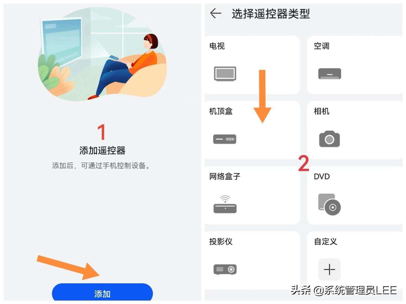 1、点击手机自带的“智能遥控”APP—点击“添加”—选择你要添加的遥控器类型,比如我在APP里添加的是机顶盒和电视机。