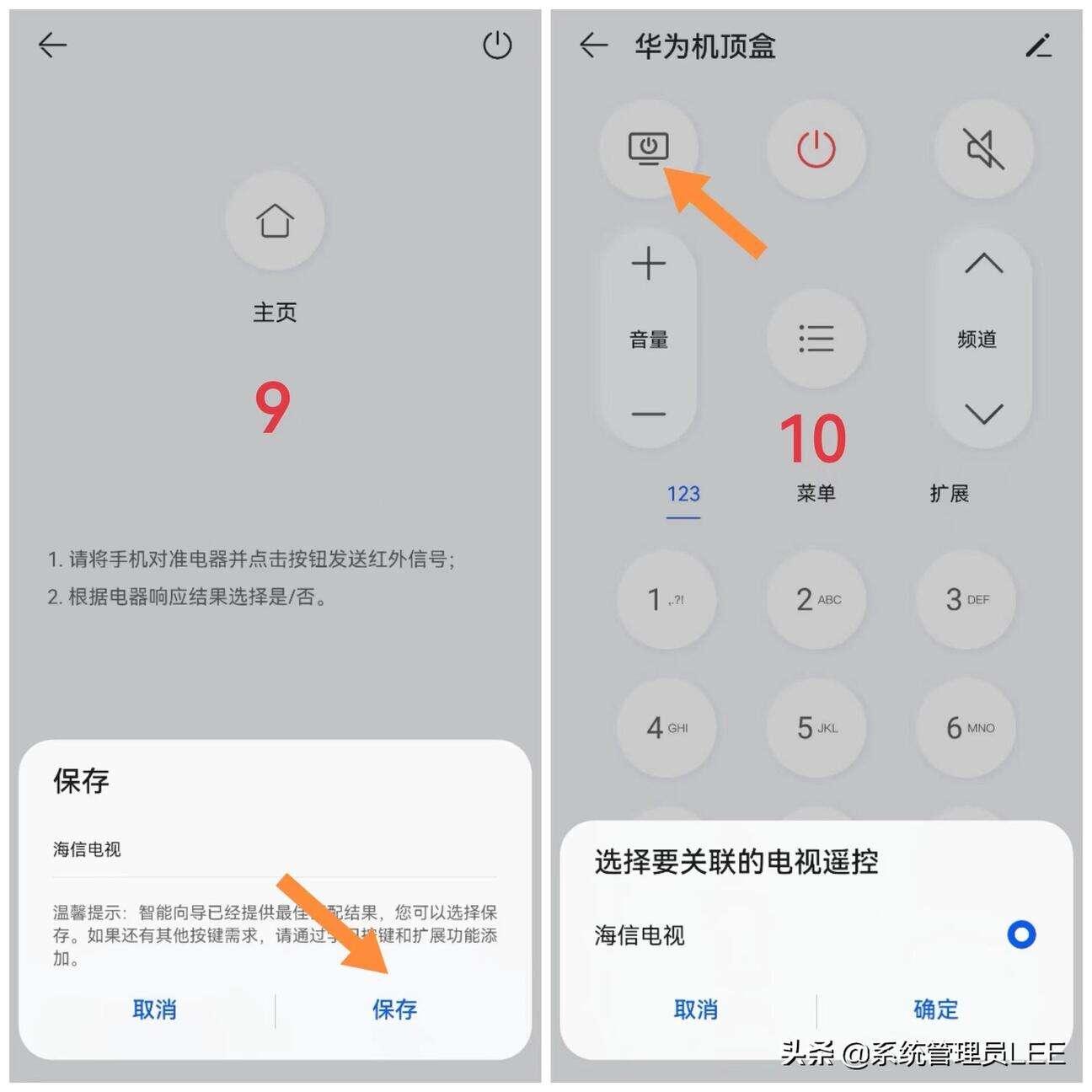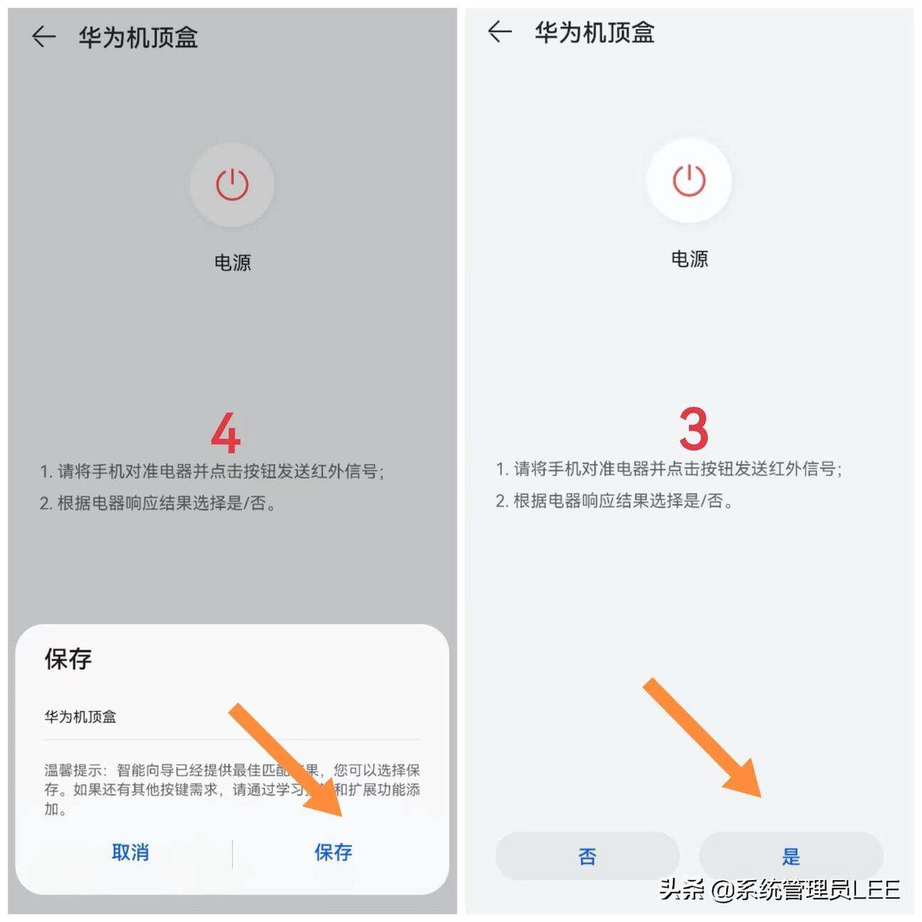 2、选择完机顶盒后—添加机顶盒的品牌—接下来要将手机对准机顶盒—点击电源键(当适配正确时,机顶盒会自动开启)最后点击保存即可。