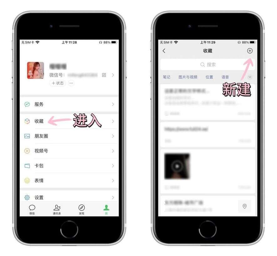 如果你需要的长截图内容不是网页,只能多截图,然后打开微信,点击右下角的【我】-【收藏】-【新建笔记】。