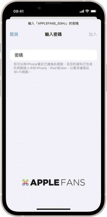 使用者在「设定」>「Wi-Fi」页面,选择要加入的Wi-Fi 网路后,在「输入密码」同时,可以将你的iPhone 靠近已连接此Wi-Fi 网路朋友的iPhone。