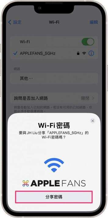 当朋友的iPhone 接收到你的Wi-Fi 密码请求时,就会跳出”要与XXX 分享「Wi-Fi SSID 名称」的Wi-Fi 密码吗?“,这时选择「分享密码」,Wi-Fi 密码就会一键分享给你啰~
