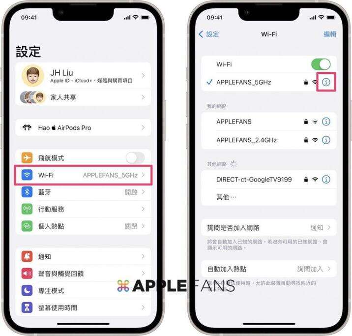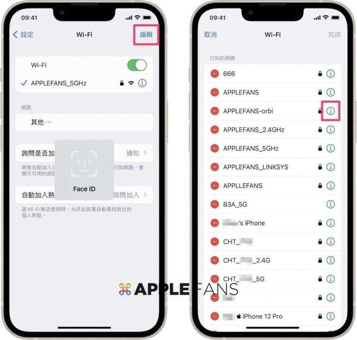 请在「设定」>「Wi-Fi」页面,点击右上角的「编辑」,透过Face ID、Touch ID 或是密码解锁后,就可以选择已知的网路,此步骤以【APPLEFANS-orbi】为例,点击右侧的「