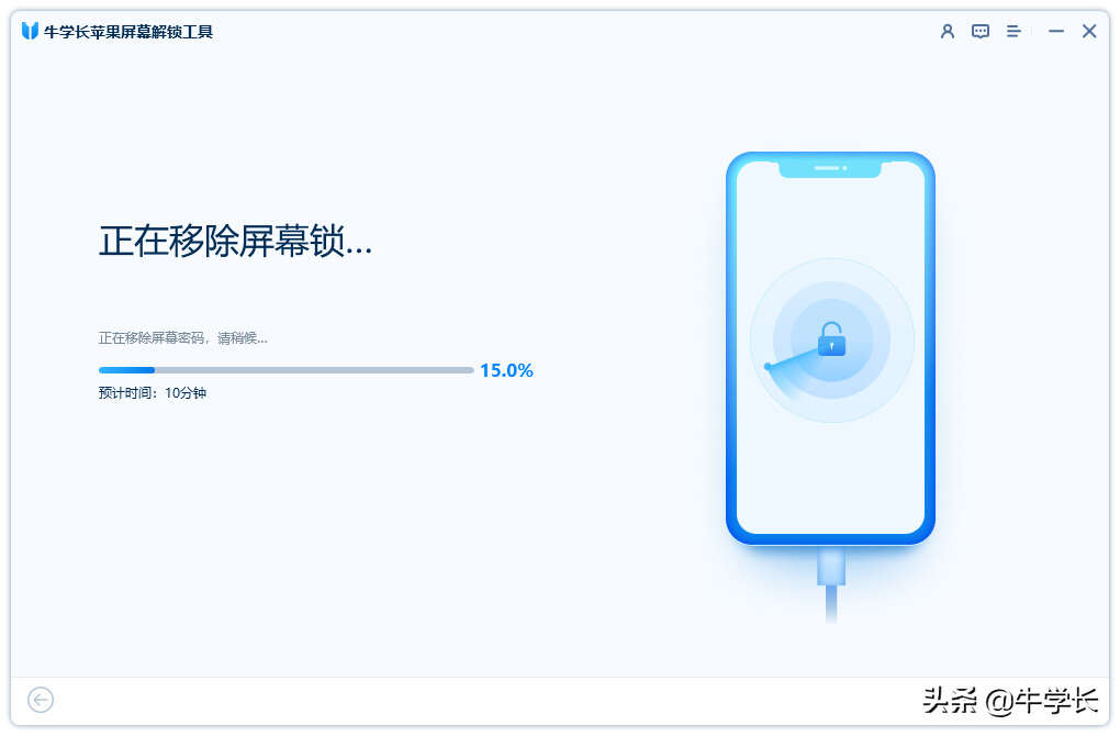 第4步:固件下载完成后,点击“开始移除”,即开始删除iPhone锁屏密码。整个过程大概需要10分钟,删除密码进程中请不要随意终止进程,避免设备变砖。