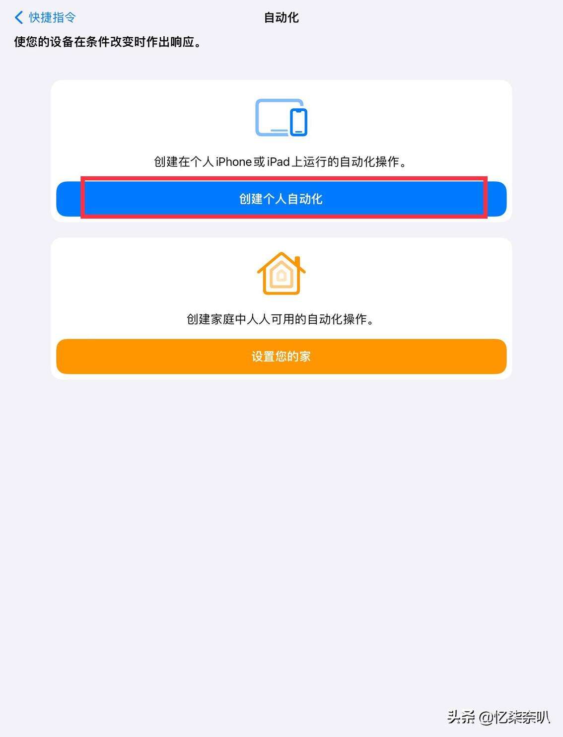 第二步,然后打开快捷指令,点击中间的自动化,可以看到有两个选项,点击创建个人自动化