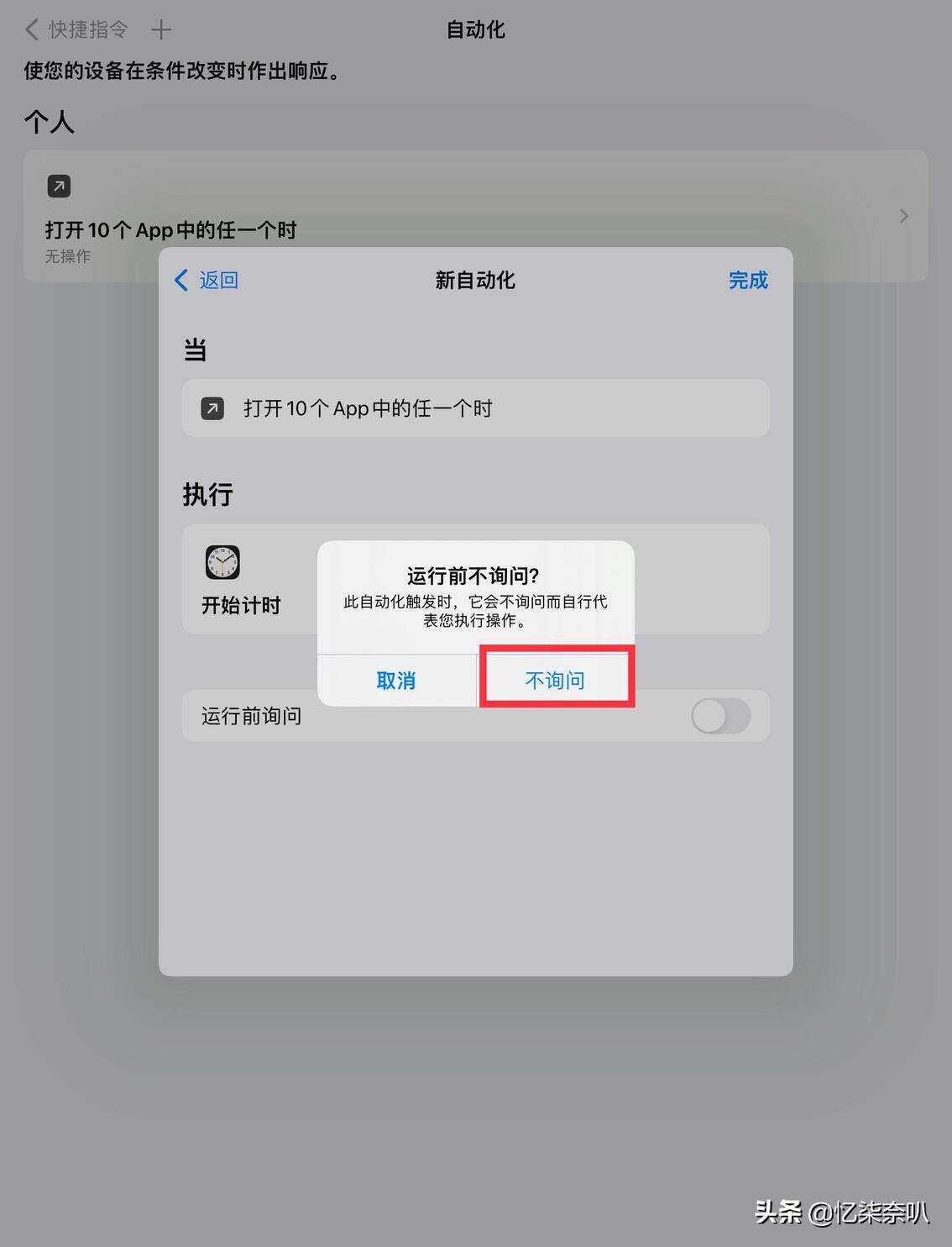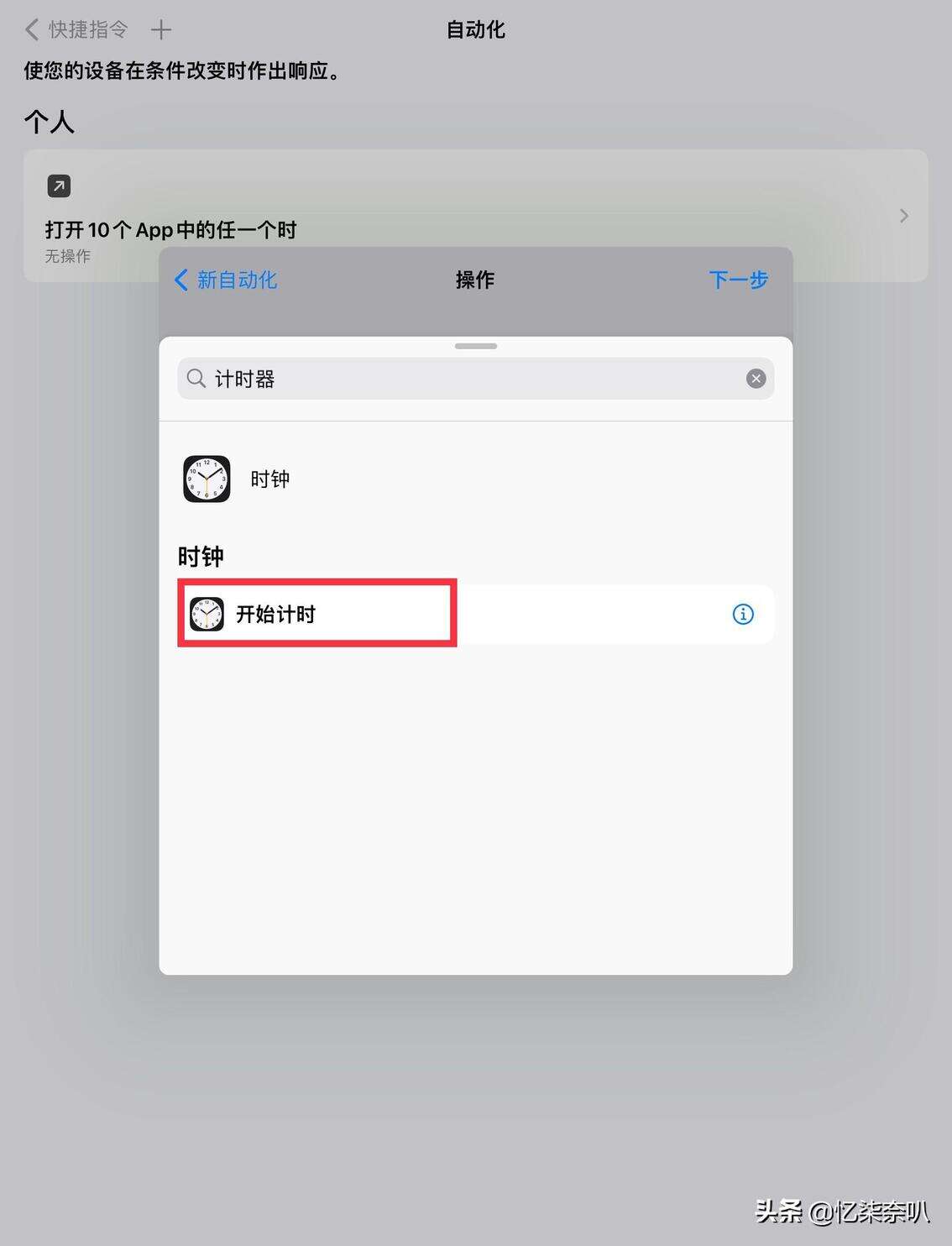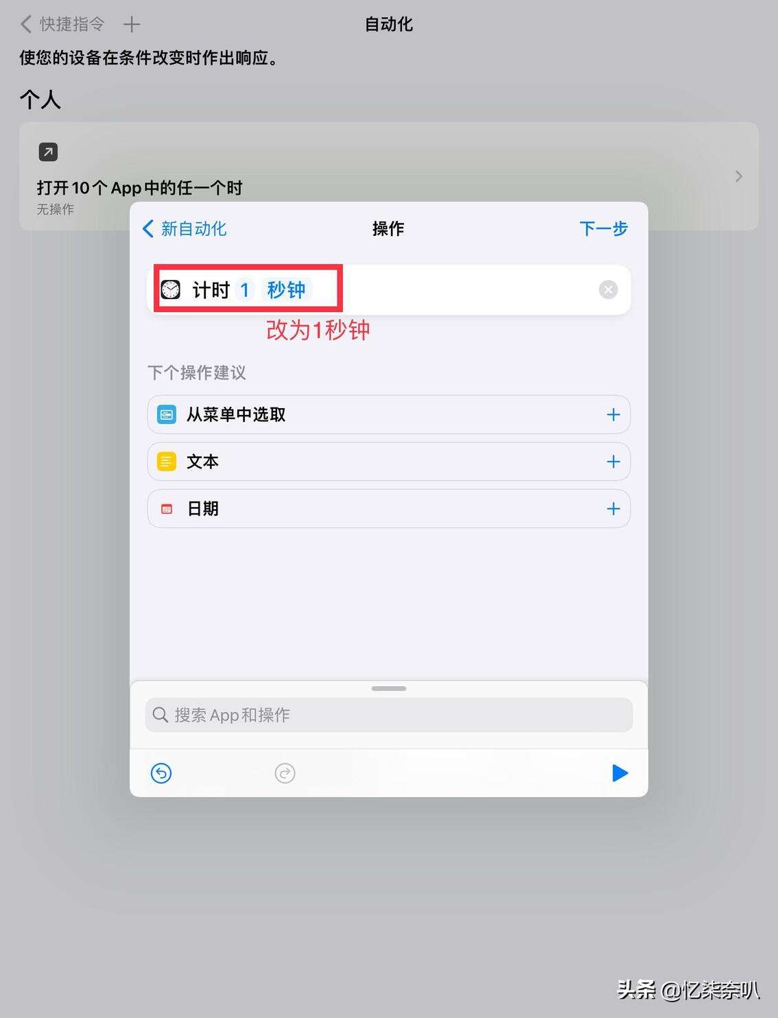 第四步,选择要加密的App后,然后就会出现一个页面,点击添加操作,并在搜索栏搜索“计时器”,选择开始计时,然后把计时改为1秒钟(当然也可以多设置几秒,根据你自己的情况来),点击下一步,把运行前询问关闭就可以啦!