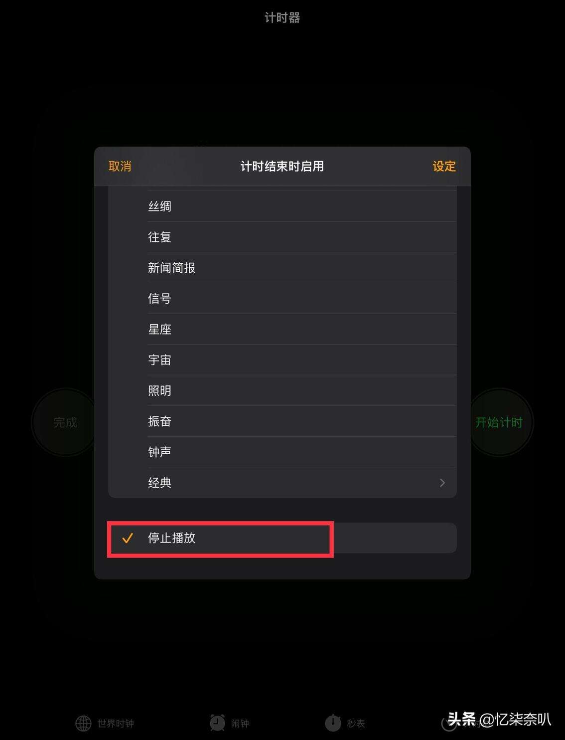 第一步,在手机或平板里找到时钟,点开计时器,选择停止播放,点击设定