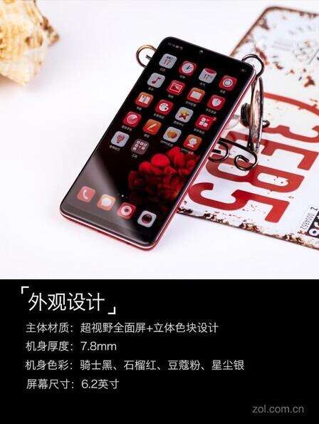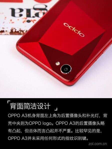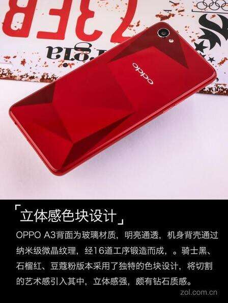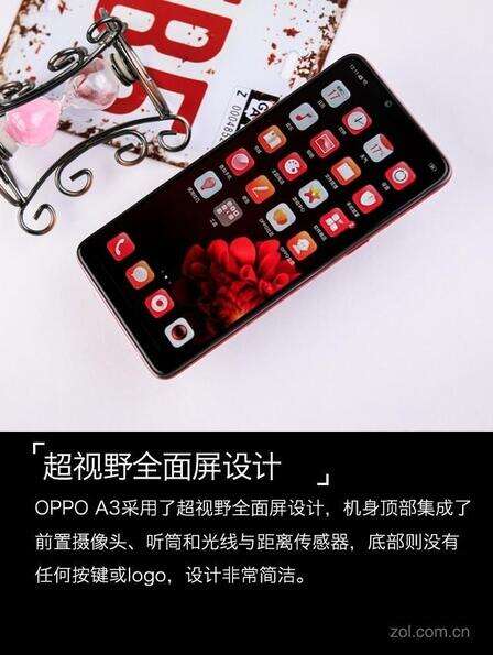 OPPO A3是OPPO第二款采用超视野全面屏的机型,正面与OPPO R15非常相似,背面则为直板玻璃设计,机身大小适中,握持手感极佳,共有骑士黑、石榴红、豆蔻粉和星尘银4种配色。我们拿到的是石榴红版本。