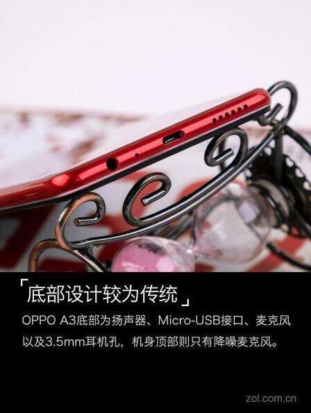 OPPO A3底部为扬声器、Micro-USB接口、麦克风以及3.5mm耳机孔,机身顶部则只有降噪麦克风。