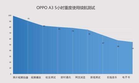 续航方面,OPPO A3采用了3400mAh电池,充电速率为5V/2A。为了测试OPPO A3的续航与充电水平,我们引入中关村在线5小时续航测试和30分钟充电速度这两项来评估手机的续航能力。