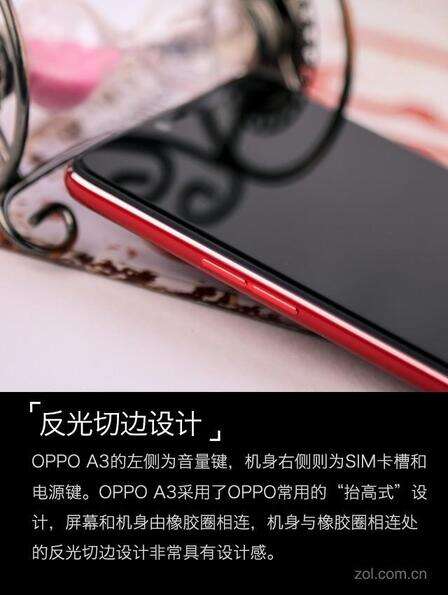 在机身其他细节方面,OPPO A3的左侧为音量键,机身右侧则为SIM卡槽和电源键。OPPO A3采用了OPPO常用的“抬高式”设计,屏幕和机身由橡胶圈相连,机身与橡胶圈相连处的反光切边设计非常具有设计感。
